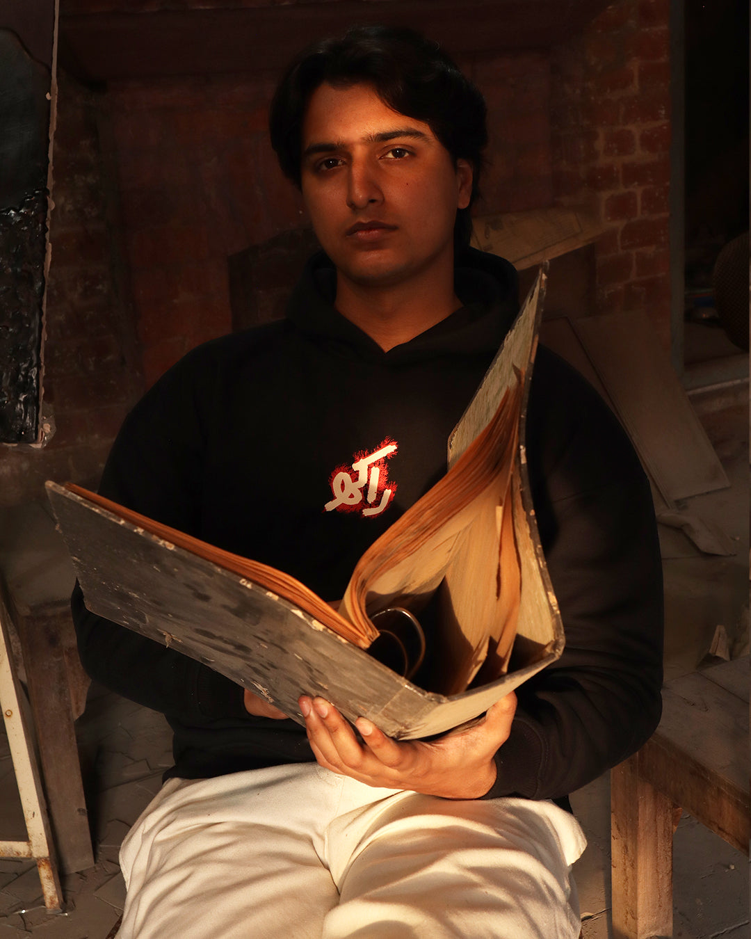 Urdu typography and illustrated artwork, screen-printed on the back with textured, ash-like detailing